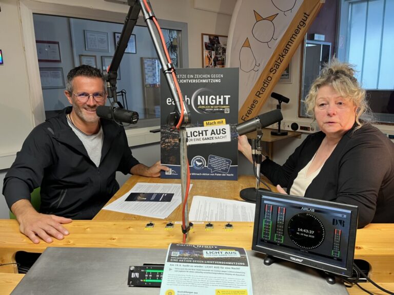 Über Lichtverschmutzung und Lichtverschwendung sprechen im Studio des Freien Radio Salzkammergut Ursula Asamer (Natur- und Landschaftsvermittlerin im Naturpark Attersee Traunsee und Naturwache-Organ) und Clemens Schnaitl (Schutzgebietsmanager Naturpark Attersee-Traunsee und Koordinator von Österreichs ersten Sternenpark sowie Obmann des Vereins „Paten der Nacht“).
